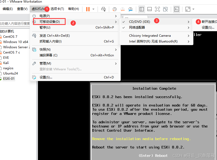 ESXi:直接安装在物理硬件上,不需要操作系统。是裸机虚拟化管理程序。