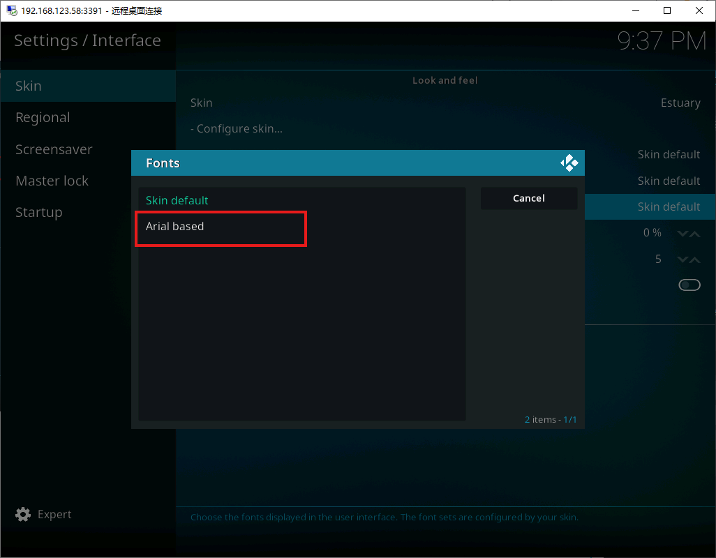 Kodi设置为中文语言界面需设置字体为基于Arial,否则将显示乱码一片,英文能显示,中文显示为方框。